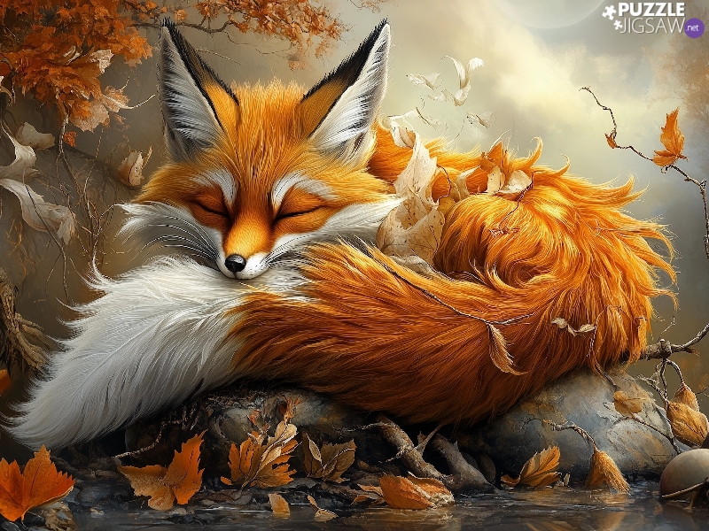 Fox, graphics, Leaf, Autumn, ginger, sleepy