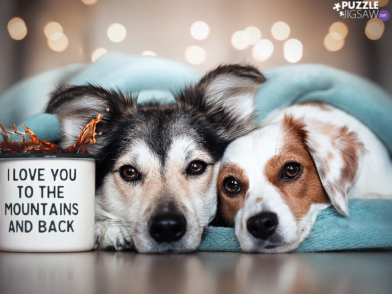 Two cars, coverlet, Cup, Dogs