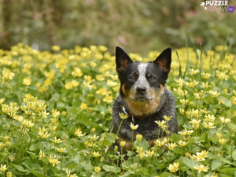 Yellow, Flowers, Australian cattle dog, Meadow, dog