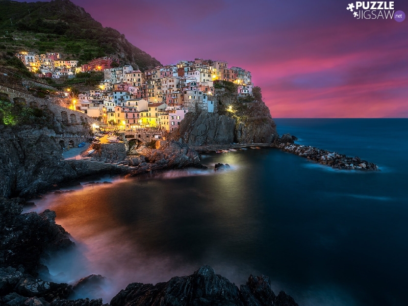 rocks, Houses, creek, City of Manarola, Riomaggiore Municipality, light, color, Italy, Night, Ligurian Sea, Region of Liguria, Province of La Spezia