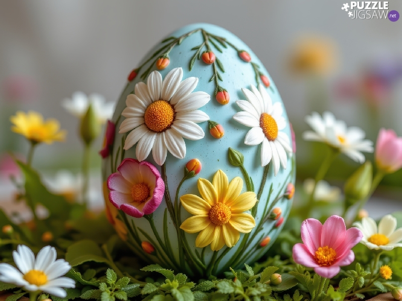 Easter egg, Flowers, Tulips, White, daisies, Blue, Easter, Yellow