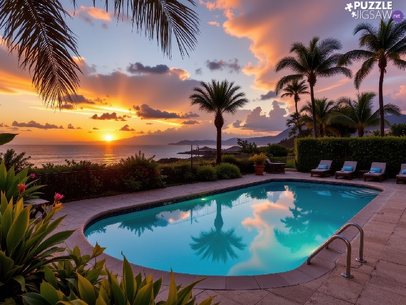 Flowers, Garden, sea, Palms, Pool, Great Sunsets, deck chair