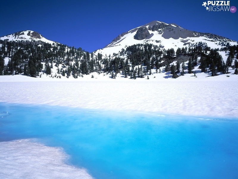 Frozen, River, snow, forest, Mountains