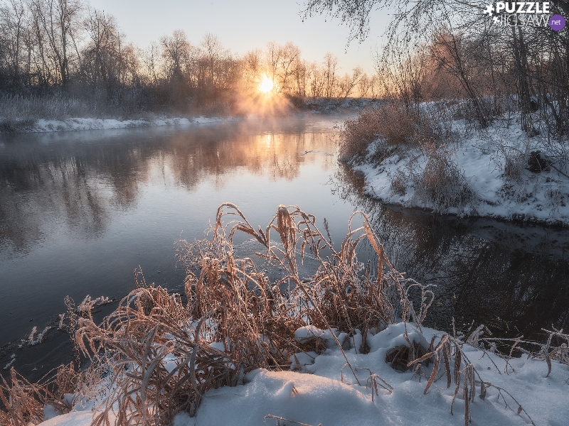 trees, viewes, rays of the Sun, grass, Fog, snow, winter, River