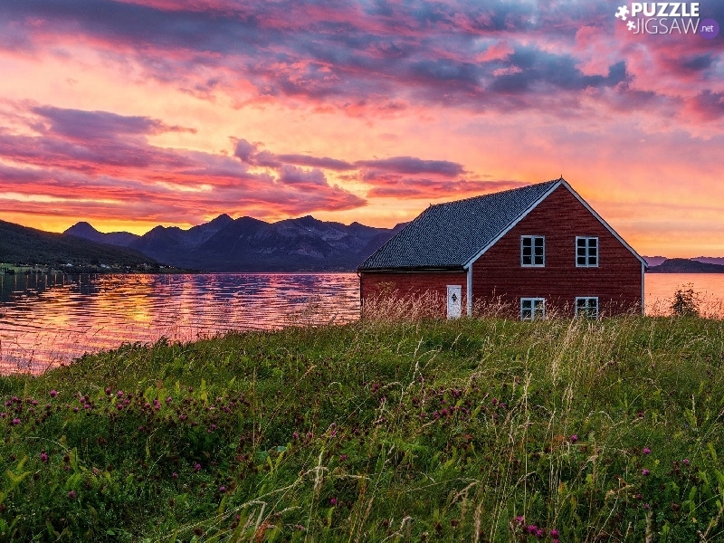 Home, Mountains, sun, lake, west