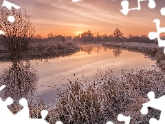 River, field, Houses, Mountains