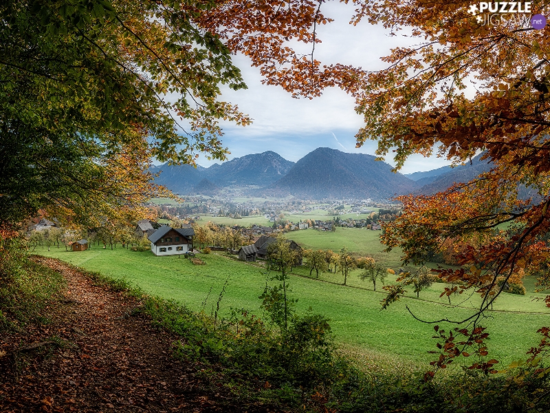 viewes, Mountains, Town, Houses, branch pics, trees