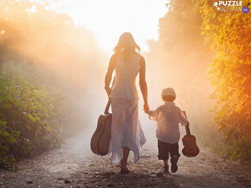 forest, Women, Fog, Way, ligh, luminosity, flash, Guitars, boy, sun, Przebijające