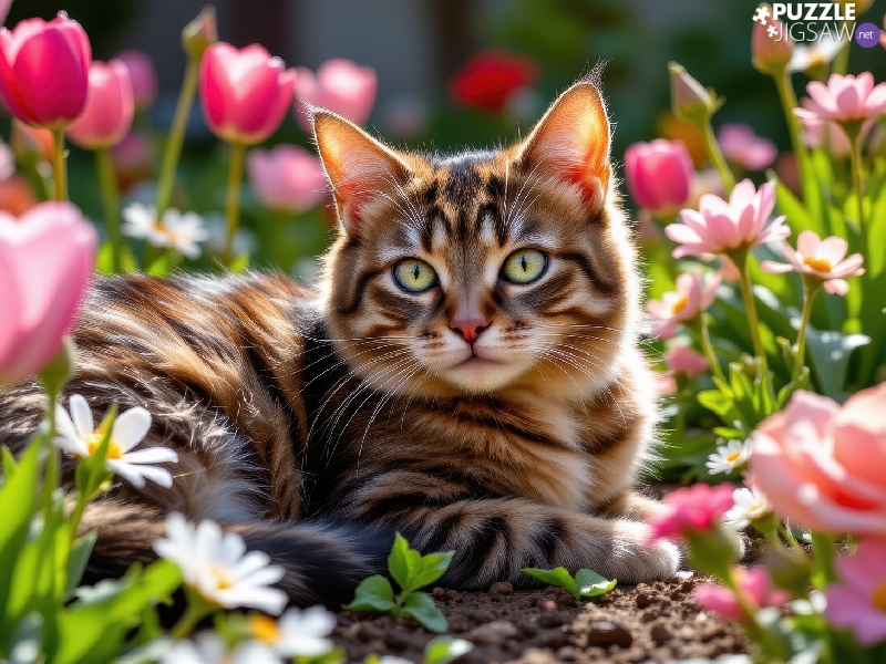 cat, dun, Flowers, lying