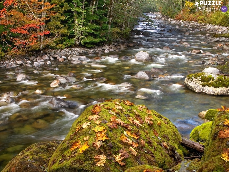 stream, forest, boulders, stony, autumn, mossy, Leaf
