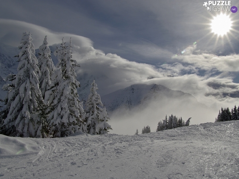Spruces, winter, clouds, Mountains, rays of the Sun