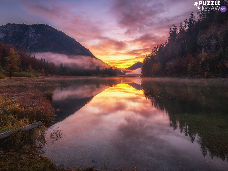 Fog, lake, forested, The Hills, Great Sunsets, Mountains