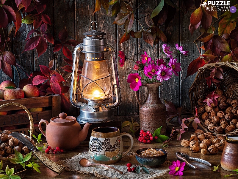 Lamp, Leaf, apples, Flowers, basket, autumn, composition, nuts