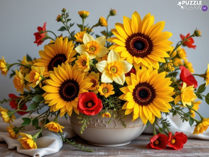 papavers, narcissus, textile, bouquet, Table, Nice sunflowers, Flowers, Vase