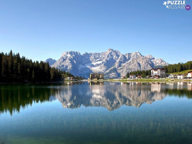 reflection, Houses, Mountains, woods, lake