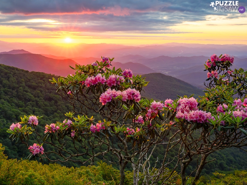 forested, flower, Mountains, Great Sunsets, The Hills, rhododendron