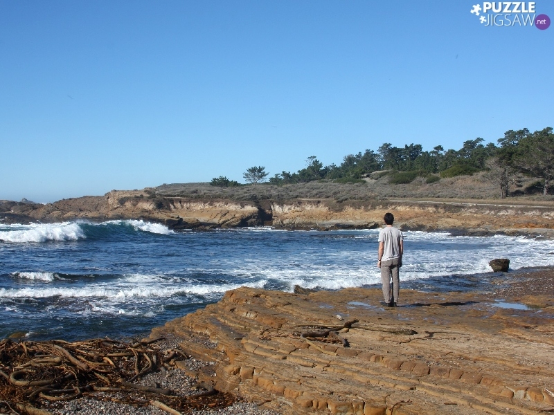 Weston, a man, rocks, water