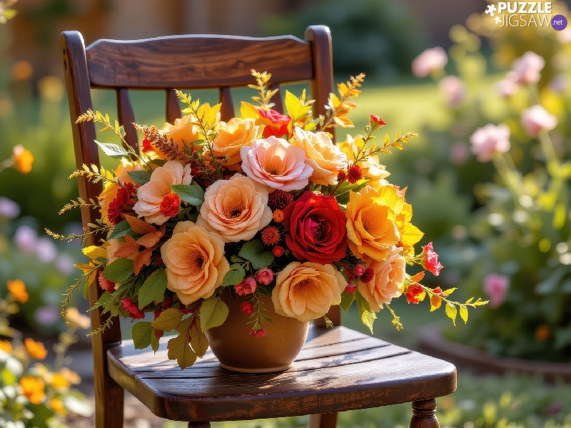 Flowers, Vase, Chair, roses