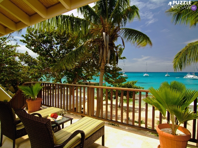 Hotel hall, Palms, sea, terrace