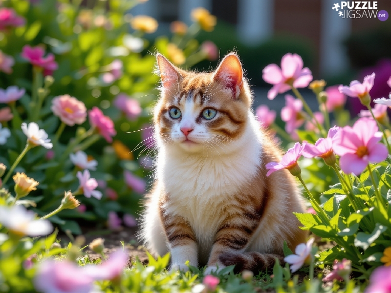 white and red, sitter, Flowers, cat