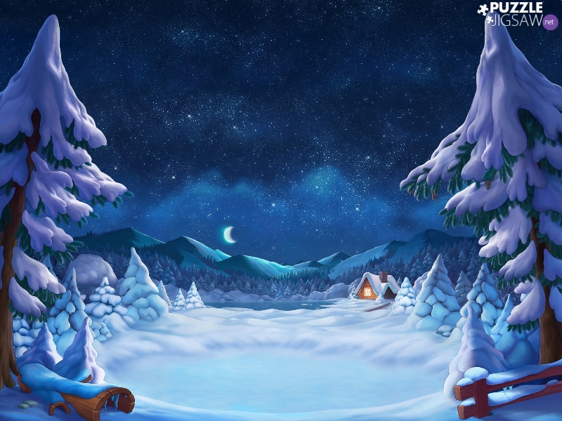 Christmas, forest, fence, star, graphics, viewes, Night, trees, moon, winter, Snowy, house, Mountains
