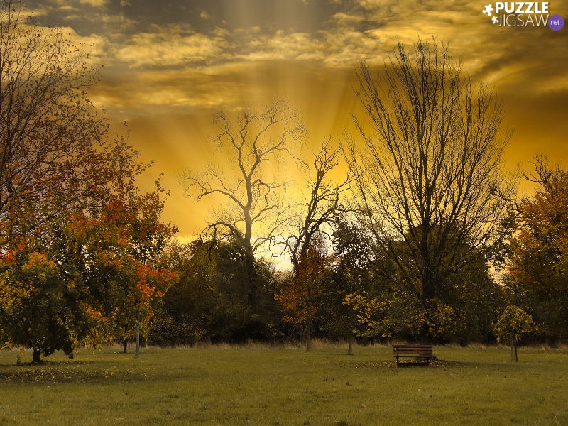 sun, Bench, viewes, luminosity, sunny, autumn, trees, Sunrise, flash, ligh