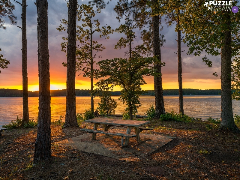 trees, State of Georgia, West Point Lake, Bench, The United States, viewes, Great Sunsets