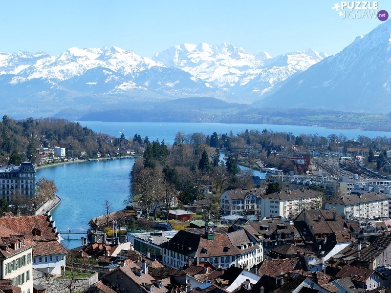 Snowy, lake, Town, Mountains