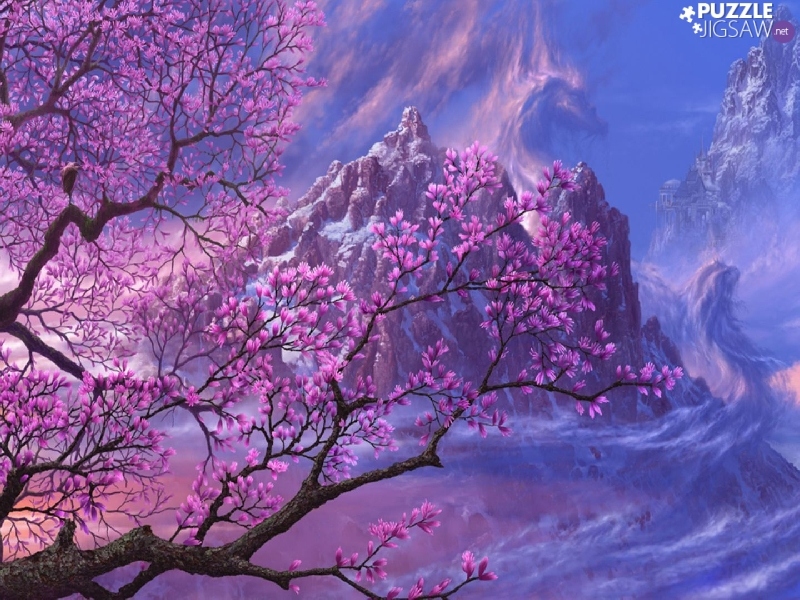 trees, Mountains, clouds