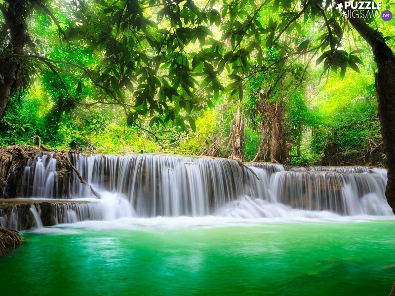 forest, waterfall, trees, viewes, flash, luminosity, ligh, sun, Przebijające