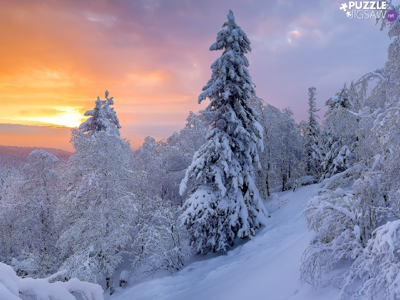 viewes, Snowy, snow, trees, winter, Sunrise, drifts