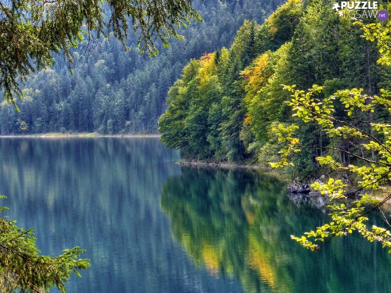 trees, viewes, forest, reflection, lake