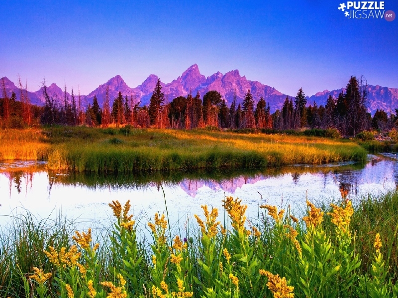 trees, viewes, River, grass, Mountains