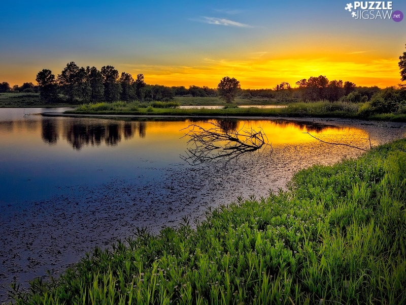 trees, viewes, sun, lake, west