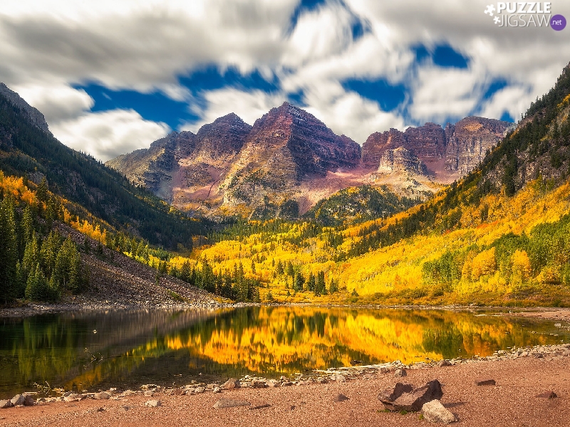Maroon Bells Peaks, Maroon Lake, The United States, trees, State of Colorado, rocky mountains, autumn, viewes