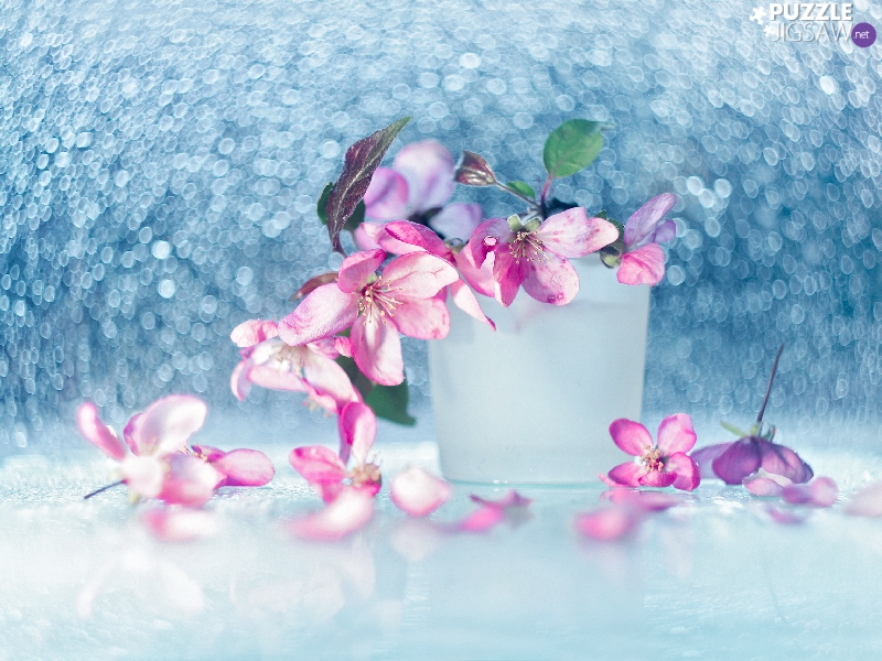 trees, Pink, vase, Bokeh, fruit, Flowers