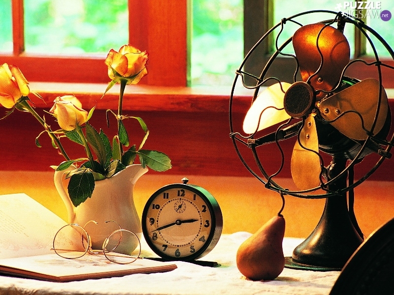 Watch, Book, Vase, ventilator, Flowers, Glasses