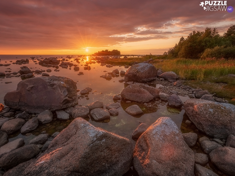 trees, Stones, Great Sunsets, coast, sea, viewes, rays of the Sun