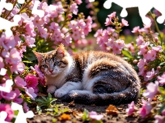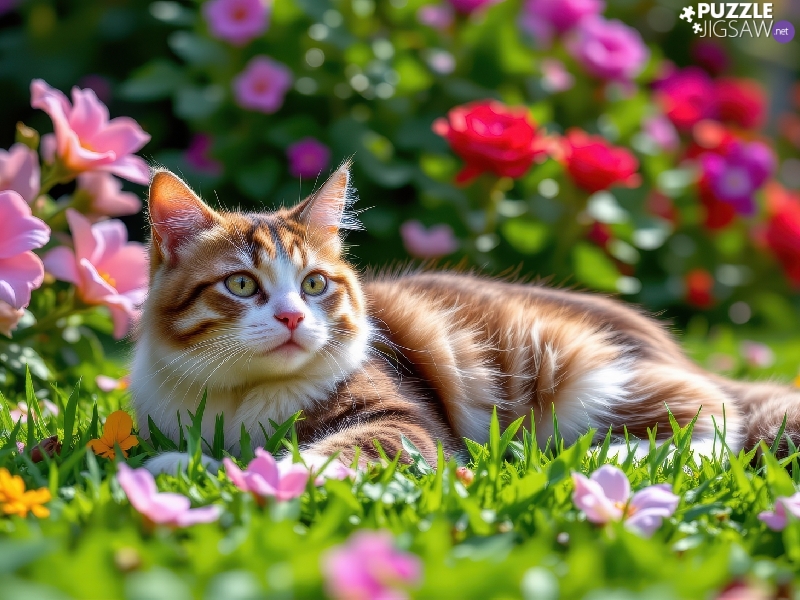 grass, Flowers, Red-white, cat, lying