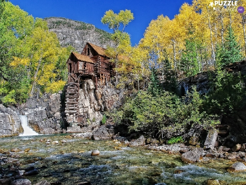 viewes, River, wooden, Home, rocks, trees
