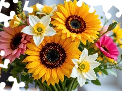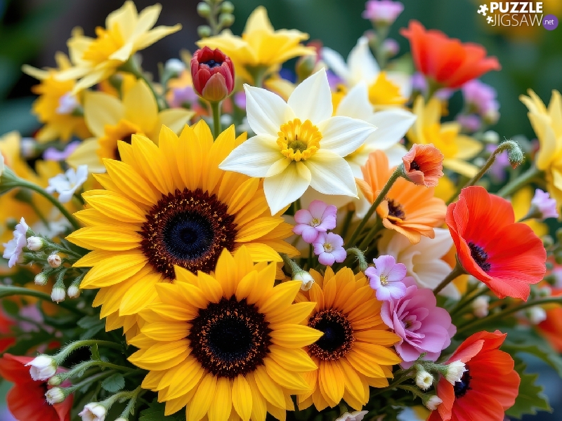 papavers, Flowers, color, bouquet, narcissus, Nice sunflowers