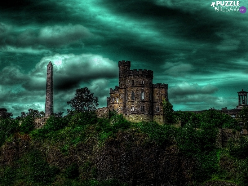 clouds, sun, Castle, west