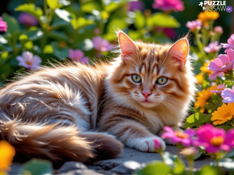 lying, color, Flowers, cat