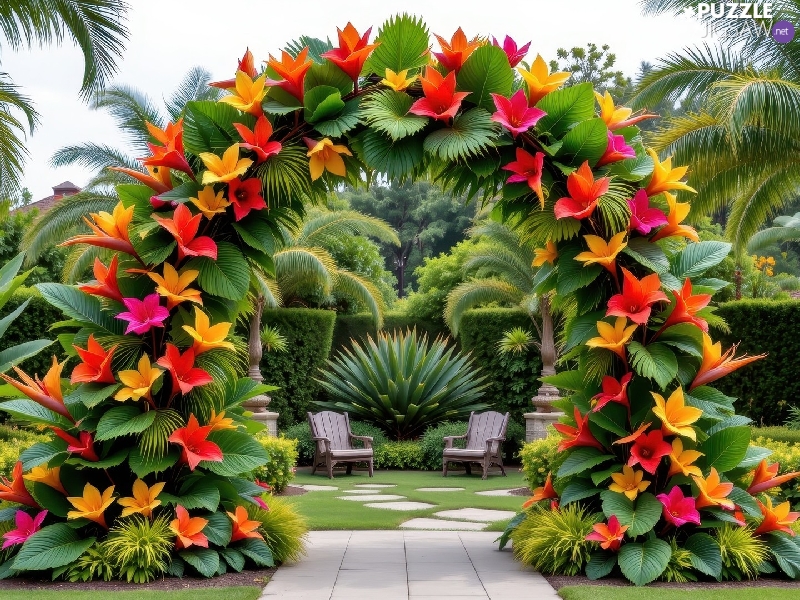 floral, Garden, Bow, Yellow, Stool, Palms, Flowers, Plants, Red