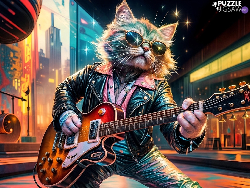 Guitar, cat, Jacked, graphics, Leather, Glasses