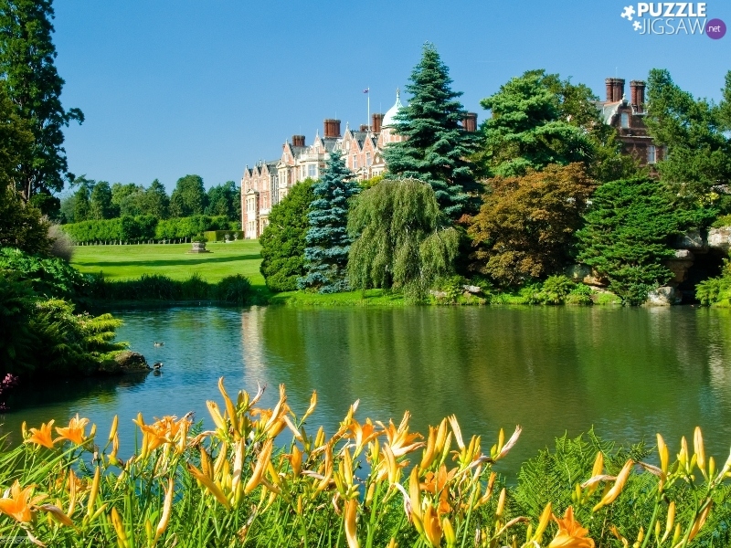 viewes, Flowers, Sandringham, trees, lake, palace, England