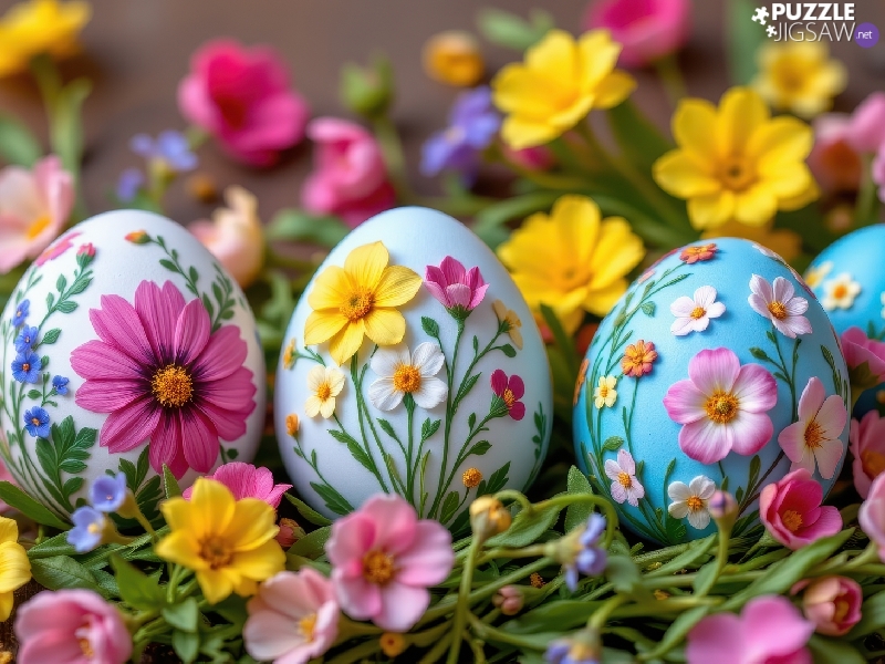 eggs, Easter, Yellow, Pink, Flowers, color