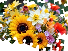 Bouquet of Flowers, narcissus, red weed, Nice sunflowers