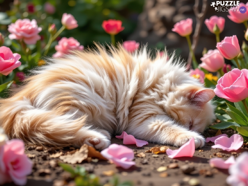 Flowers, Tulips, fluffy, sleepy, cat